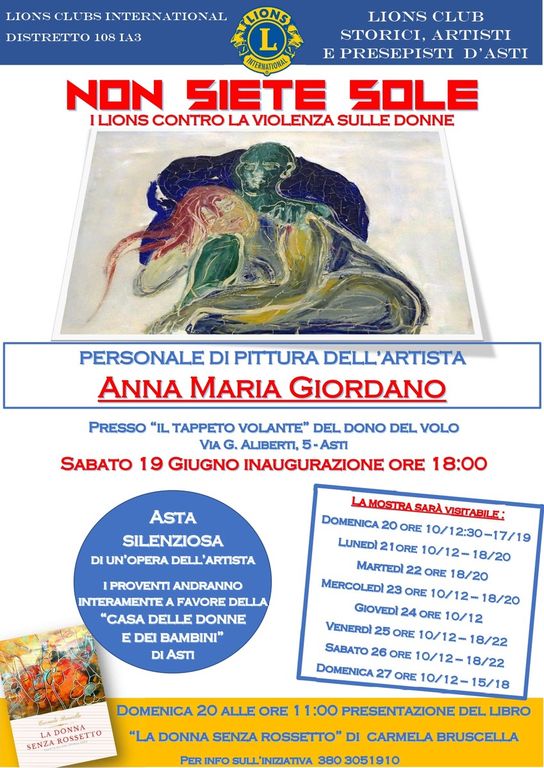 La presidente afferma che "sarà interessante poter conoscere due donne, due artiste, che hanno saputo sviscerare e rendere tangibile grazie alla loro arte un argomento sempre tristemente attuale. Questo è il fine del Lions Club invitare a riflettere e comprendere come poter evitare che capiti ad altre donne. Se dove c'è un Lions, lì c'è un bisogno, i soci del Lions Storici, Artisti e PResepisti vogliono dire in maniera convinta a tutte le donne che non sono sole".