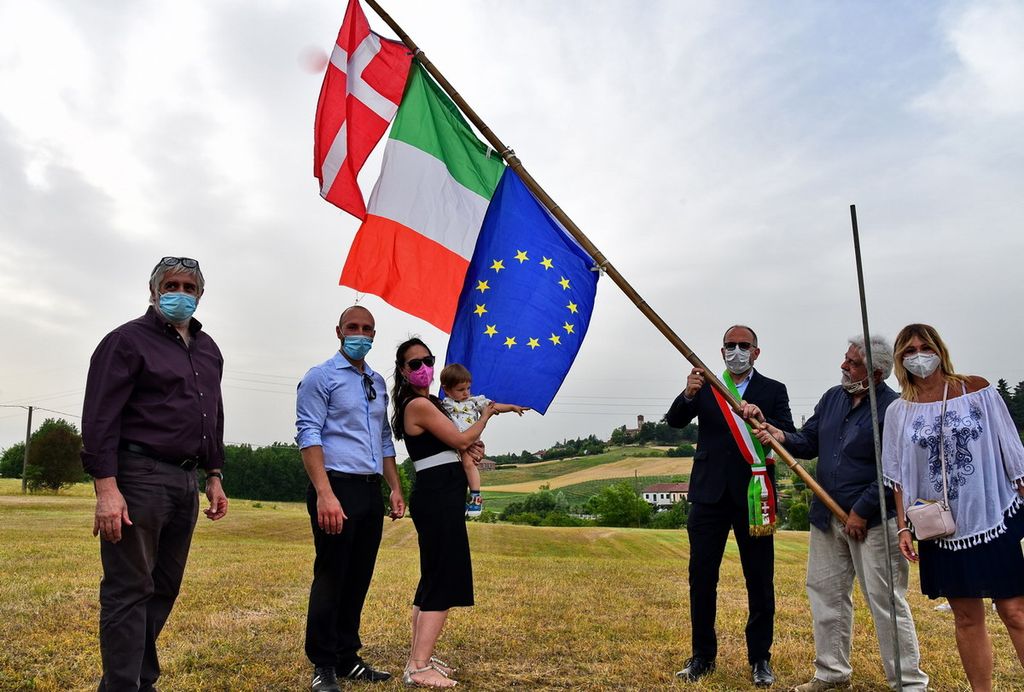 Durante la nuova presentazione della rivista 'Astigiani, Nicolò, nato il 17 marzo 2020, in braccio ai genitori, ha issato simbolicamente l’asta con le tre bandiere (la biancorossa astigiana, il Tricolore e quella europea) che da sabato segna il grande terreno dove prenderà vita il Bosco degli Astigiani.