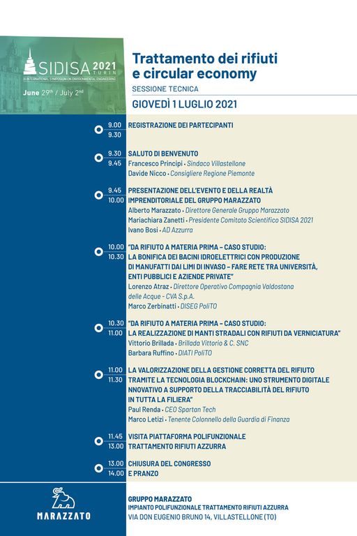 E’ in corso a Torino, dal 29 Giugno al 2 Luglio 2021, l’XI ‘Simposio Internazionale di Ingegneria Ambientale SIDISA’ promosso dall'Associazione Nazionale di Ingegneria Sanitaria Ambientale (ANDIS) e dal Gruppo Italiano di Ingegneria Sanitaria Ambientale (GITISA) in collaborazione con il Politecnico di Torino e partners Gold quali ‘Gruppo Smat’ e ‘Gruppo Marazzato’ per progetti di Ricerca & Sviluppo anche in tema di gestione dei rifiuti speciali.