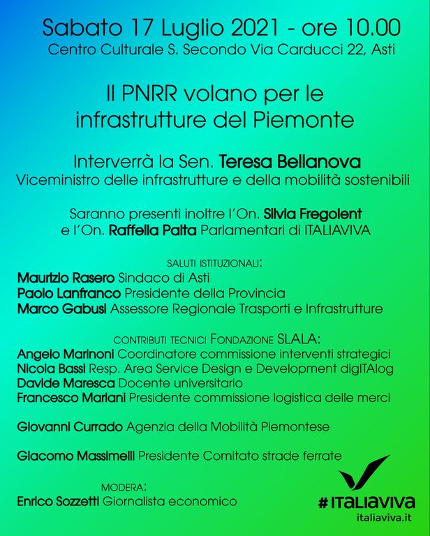 Sabato 17 luglio alle 10 al centro culturale San Secondo di Asti, ci sarà il convegno"Il PNRR volano per le infrastrutture del Piemonte" che vedrà la partecipazione del Viceministro alle infrastrutture e alla mobilità Senatrice Teresa Bellanova.