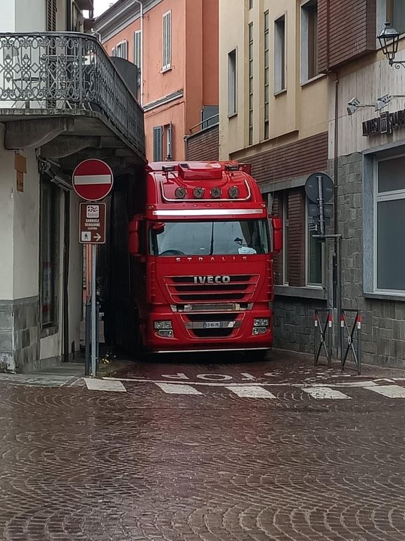 Nel giro di brevissimo tempo, in via Massimo D’Azeglio a Canelli, due camion di grosse dimensioni hanno danneggiato al passaggio i balconi delle case poste ai lati della strada, come rivelano le numerose immagini circolate. In un caso, il mezzo è rimasto addirittura incastrato a lungo, bloccando la circolazione in direzione del centro cittadino e costringendo allo smantellamento di parti dell’edificio interessato.