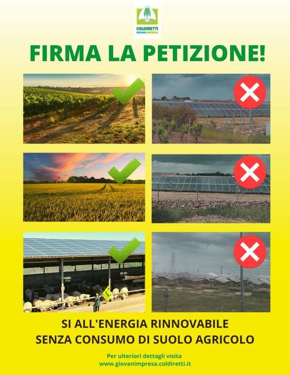 Coldiretti Giovani Impresa lancia la petizione a tutela del suolo agricolo chiedendo alle istituzioni di investire nelle fonti alternative di energia senza dimenticare il ruolo fondamentale dell’agricoltura e la bellezza unica dei nostri territori, che andrebbero compromessi senza una programmazione territoriale degli impianti fotovoltaici a terra.