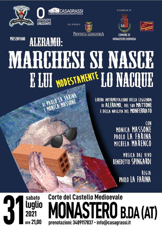 A Monastero Bormida, sabato 31 luglio alle 21, nella corte del Castello Medioevale, lo spettacolo "Aleramo: marchesi si nasce e lui, modestamente, lo nacque". Testo di Paolo La Farina con Monica Massone da un’idea di Emiliana Conti