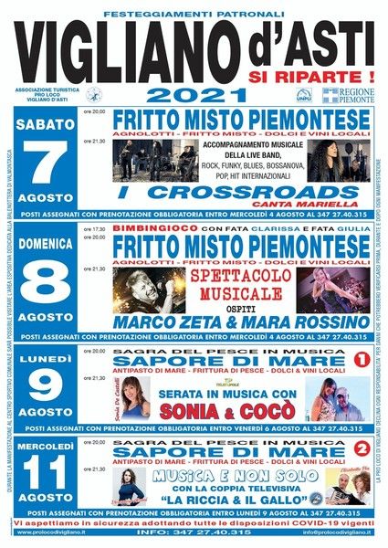 È il fine settimana dei festeggiamenti per Vigliano d'Asti. Sabato Fritto misto alla piemontese, agnolotti, dolci della nostra cucina e vini locali. L’intrattenimento musicale sarà affidato alla Live band “I CROSSROADS". Domenica alle 17,30 Bimbi in gioco con Fata Clarissa e Fata Giulia. Alle 20 serata enogastronomica. Si replica con lo stesso menù di sabato, accompagnati dallo spettacolo musicale di Marco Zeta e Mara Rossino.