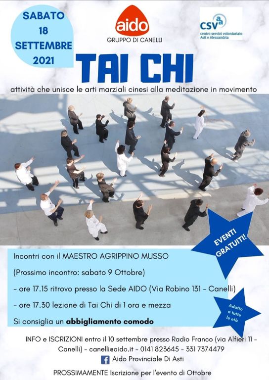 Nel cortile della Sede Aido-Fidas-Admo di Canelli in via Robino 131, il 18 settembre, si terrà la seconda prestigiosa lezione di Tai-chi con il maestro torinese Agrippino Musso (17.15 - ritrovo, 17.30 - inizio lezione). Si consiglia un abbigliamento comodo.