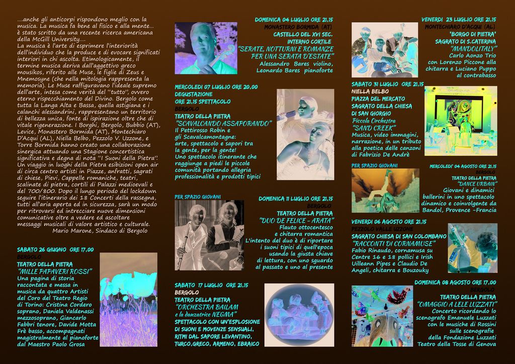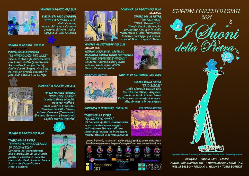 La STAGIONE CONCERTI D’ESTATE 2021 “ I Suoni della Pietra” dal 26 giugno al 12 settembre. Vede oltre 100 artisti non solo nazionali che si esibiranno all’aperto in luoghi della Pietra, Piazze, Cortili di Palazzi nobiliari, interni di Castelli medioevali, sagrati di Chiese, Pievi, Anfiteatri. Bergolo come tutta la Langa Alta e Bassa , quella Astigiana e i calanchi alessandrini, rappresentano un territorio di bellezza unica, fonte di ispirazione oltre che di vitale rigenerazione. I Borghi , Bergolo, Bubbio (AT) Levice, Monastero Bormida (AT) , Montechiaro d’Acqui (AL) Niella Belbo ,Pezzolo VC. Uzzone e Torre Bormida hanno creato una collaborazione sinergica attuando un percorso musicale oltre che culturale degna di nota. I 18 spettacoli messi in cartellone rappresentano uno spaccato contemporaneo ma anche storico dell’Arte musicale non tralasciando le usanze anche di popolazioni “emergenti”.