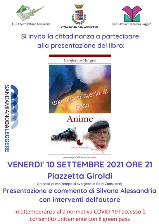 Il 10 settembre, sempre in piazzetta Giroldi, sarà presentato il libro di Gianfranco Miroglio, "Anime" con la presentazione di Silvana Alessandria, ingresso consentito con Green Pass.