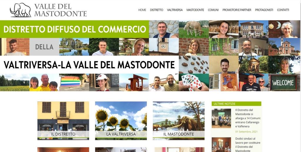 Il portale si apre sui volti sorridenti degli operatori economici dei Comuni aderenti alternati a scorci del vasto territorio (circa 142 chilometri quadrati) sul quale si sviluppa il distretto. Nel blocco successivo troviamo sei finestre selezionabili che danno accesso ad altrettante sezioni: la prima illustra il distretto stesso, la seconda il territorio della Valtriversa, la terza l’era in cui in queste zone vivevano i mastodonti che danno il nome al distretto, la quarta elenca promotori e partner dell’iniziativa, la quinta consente di approfondire in modo dettagliato i 14 Comuni che compongono il distretto e l’ultima, certo non per importanza, vede suddivisi comune per comune coloro che danno materialmente vita a questo progetto commerciale.