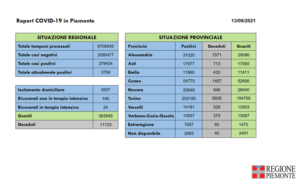 Il totale dei casi positivi diventa quindi 379.434,così suddivisi su base provinciale: 31.020 Alessandria, 17.977 Asti, 11.960 Biella, 54.770 Cuneo, 29.549 Novara, 202.180 Torino, 14.181 Vercelli, 13.557 Verbano-Cusio-Ossola, oltre a 1.557 residenti fuori regione, ma in carico alle strutture sanitarie piemontesi. I restanti 2.683 sono in fase di elaborazione e attribuzione territoriale.