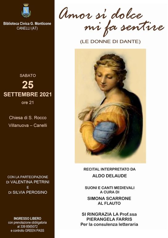 Sabato 25 settembre alle 21, nella suggestiva cornice della storica Chiesa di San Rocco, a Villanuova, l’attore e regista Aldo Delaude metterà in scena il recital dedicato a Dante 'Amor sì dolce mi fa sentire', accompagnato dalle sapienti note del flauto di Simona Scarrone.