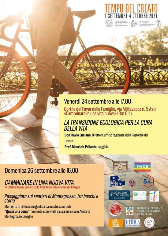 In occasione della “Gionata per la salvaguardia del creato”, le Acli di Asti hanno messo a punto un programma di interessanti appuntamenti. Il primo dei quali è in programma giovedì pomeriggio, alle 17, nel cortile del foyer delle famiglie, in via Milliavacca 5. Ne saranno protagonisti il fondatore di Slow Food Carlo Petrini e il giornalista astigiano Carlo Cerrato che, nell’ambito di una puntata autunnale della rassegna "Senza perdere la tenerezza", presenteranno i loro libri e parleranno di Pace, ambiente, transizione ecologica.