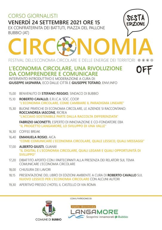 A fare gli onori di casa sarà il sindaco di Bubbio Stefano Reggio, che aprirà i lavori, introdotti dall’intervento di Roberto Cavallo, divulgatore ambientale ed esperto di economia circolare. A seguire ci sarà spazio per alcune case-history, con interventi di Roccandrea Iascone, che parlerà dell’intensa attività condotta nell’ambito del nuovo paradigma economico da Ricrea-Consorzio Nazionale per il Riciclo e il Recupero degli Imballaggi in Acciaio, e Fabrizio Iaconetti, esperto di innovazione e fondatore di EBA, che parlerà del progetto Langamore.