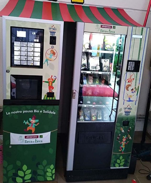 La Scuola di circo ospita il primo e unico distributore automatico di bevande calde e fredde e di spuntini provenienti da agricoltura biologica e dalle filiere del commercio equo e solidale, in provincia di Asti.
