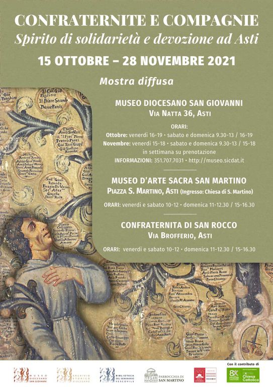 Venerdì 15 ottobre aprirà al pubblico la mostra diffusa “Confraternite e Compagnie. Spirito di solidarietà e devozione ad Asti” che coinvolgerà il Museo Diocesano San Giovanni (via Natta 36), il Museo d’Arte Sacra San Martino (piazza San Martino, ingresso dalla chiesa di San Martino) e la Confraternita di San Rocco (via Brofferio).