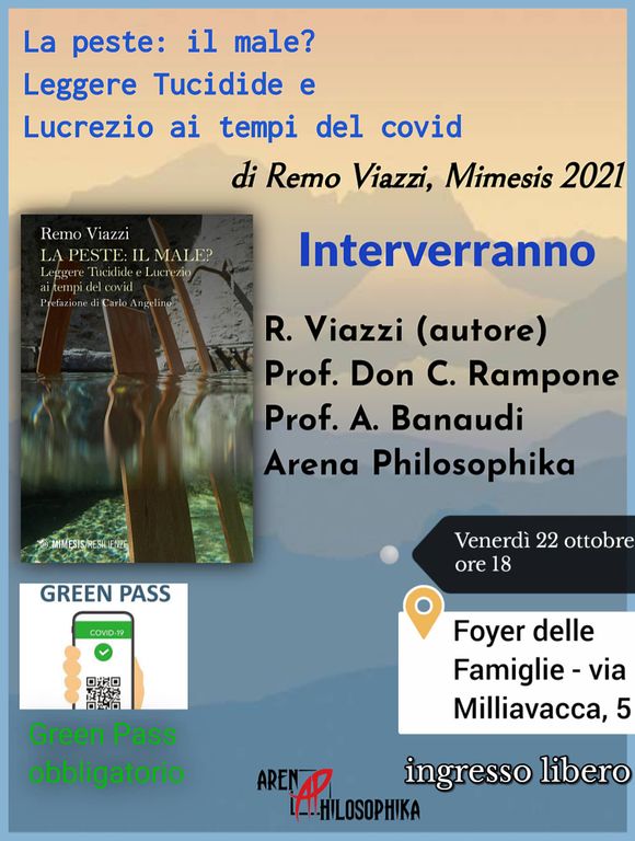 Venerdì 22 ottobre alle 18 sarà la volta de "La peste: il male? Leggere Tucidide e Lucrezio ai tempi del Covid", di Remo Viazzi (Mimesis). Interverranno, insieme all'autore, anche don Carlo Rampone e il professor Alberto Banaudi, oltre che una rappresentanza di Arena Philosophika.