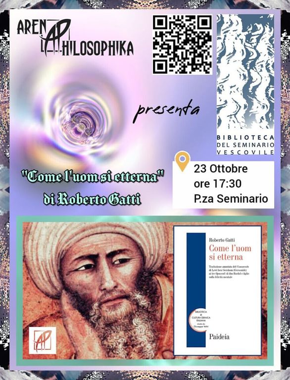 Sabato 23, invece, alle 17.30 sarà presentato "Come l'uom si etterna" (Claudiana Paideia) di Roberto Gatti, presso la Biblioteca del Seminario Vescovile di Asti. Una traduzione annotata del Commento di Lewi ben Gershom (Gersonide) ai tre Opuscoli di ibn Rushd e figlio sulla felicità mentale.