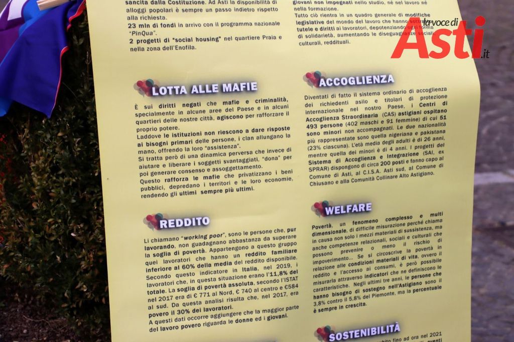 Hanno aderito: Rete Welcoming Asti, Libera, ACLI, ANPI, Fiom, CGIL, Asti cambia, Cittadinanzattiva Piemonte Aps - Asti, Altri tasti, Noix de Kola, Pastorale sociale del lavoro, Coordinamento Asti Est, Centro Missionario Diocesano, Movimento Stop al consumo di territorio astigiano, Forum Salviamo il paesaggio, Comitato astigiano per le acque pubbliche.