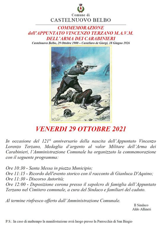Venerdì 29 ottobre, in occasione del 121esimo anniversario della nascita dell’Appuntato Vincenzo Lorenzo Terzano, Medaglia d'Argento al valor Militare dell'Arma dei Carabinieri, l'amministrazione di Castelnuovo Belbo ha organizzato un'importante commemorazione.