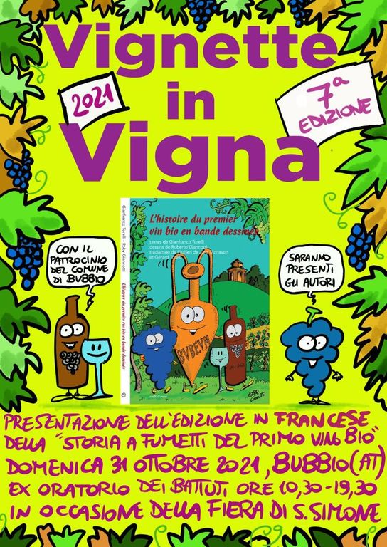 Settima edizione di Vignette in Vigna a Bubbio, l'evento che unisce vino, il territorio della Langa Astigiana e umorismo, creato nel 2015 dal vigneron Gianfranco Torelli e dal cartoonist Roby Giannotti: domenica 31 ottobre alla Fiera di San Simone presso l'ex Oratorio dei Battuti, dalle 10,30 alle 19,30 presenteranno la traduzione in francese del loro libro “Storia a fumetti del primo vino Bio”, già vincitore nel 2020 ad Alba del premio letterario nazionale “Bere il territorio” di GoWine.