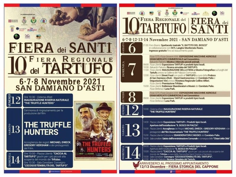 La Fiera del Tartufo continuerà con la Fiera dei Santi il 12, 13 e 14 novembre. Tartufi al centro anche del film documentario “The truffle hunters”, diretto dai registi Michael Dweck e Gregory Kershaw che il 13 e 14 novembre saranno ospiti della Fiera. “Si tratta di una produzione molto importante per far conoscere il nostro territorio – sostiene Flavio Torchio – poiché avrà una distribuzione mondiale grazie a Sony Pictures”.