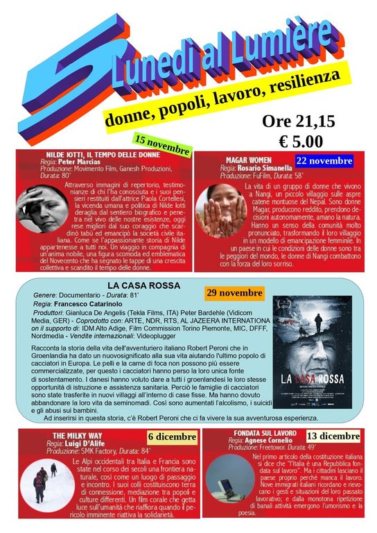 Il 15 novembre prossimo prenderà il via presso il cinema Lumière di corso Dante il ciclo di documentari “Donne, popoli, lavoro, resilienza”, che si svilupperà nell’arco di cinque lunedì consecutivi.