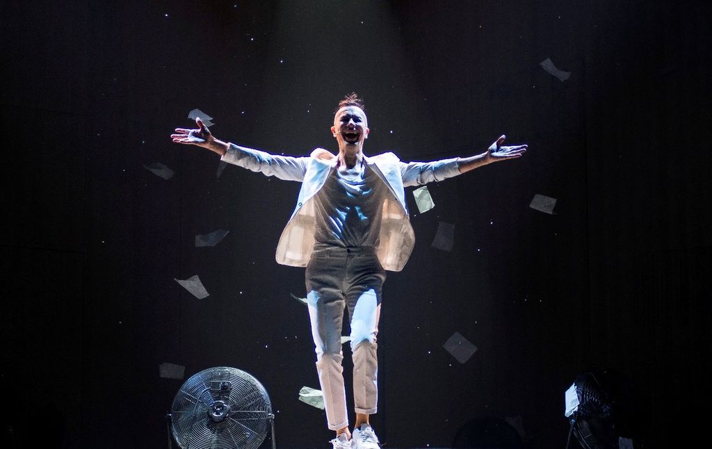 È uomo, donna, vecchio, giovane, alto, basso, è Wonder Woman ma anche Hulk, è Pavarotti ma subito dopo Elvis Presley. Ed è un uomo con la sindrome di Peter Pan alle prese con un’ombra indisciplinata (Kevin Michael Moore) che vuole farlo crescere.