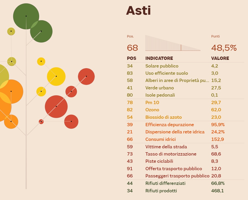 Giancarlo Dapavo, Legambiente Asti rimarca: "“Gli indicatori sulla qualità dell’aria, sul tasso di motorizzazione e sulle vittime della strada sono negativi in quasi tutta la Regione – così come quelli relativi ad offerta ed uso del trasporto pubblico, Asti praticamente inefficace, a mq di ciclabili e di isole pedonali pro-capite, Asti ultima per ciclabilità. Praticamente tutta la regione è rossa in relazione alle rinnovabili su edifici pubblici, bene solo Torino in relazione al consumo di suolo, quest’ultimo un trend che ci auguriamo venga confermato dal capoluogo. Scarso il verde fruibile e non alta la presenza di alberi urbani ogni 100 abitanti; Asti ultima in Piemonte, bene la qualità della rete fognaria ma ancora alta la dispersione di acqua e il suo consumo, criticità che peseranno sempre più sulle nostre città in ottica di resilienza e contrasto ai cambiamenti climatici. Pedonalizzazione carente in tutte le città della regione anche Torino nonostante l'incremento del 2020, Asti ultima in centro nord Italia per pedonalizzazione pro capite".