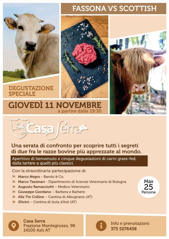 Giovedì 11 novembre alle 19.30 appuntamento a Montegrosso Cinaglio, nell’azienda agricola grass-fed Casa Serra, per “Fassona vs Scottish”, una serata di confronto da non perdere, per scoprire tutti i segreti di due fra le razze bovine più apprezzate al mondo. Dopo l’aperitivo di benvenuto, agli ospiti sarà offerta l’esclusiva opportunità di degustare cinque straordinari tagli, dalla tartàre a quelli più classici, di Fassona Piemontese e Scottish Highland provenienti dai pascoli di Casa Serra, l’azienda agricola diretta dalla famiglia Cerrato.