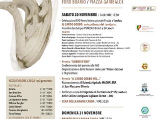 Si inizierà sabato 20 novembre dalle 10.30 con una tavola rotonda dal tema "Il cardo gobbo: un'eccellenza del territorio", a cura dei club Unesco Asti e Canelli, nell'ambito delle celebrazioni FAO Anno Internazionale Frutta e Verdura.