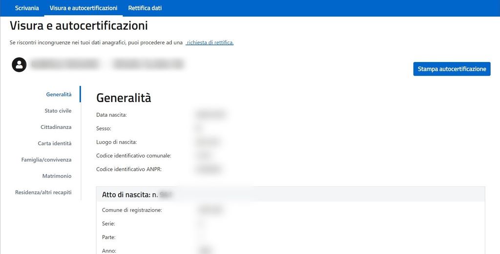 Una volta all’interno del sistema, ci si ritroverà in una sezione riepilogativa dei propri dati anagrafici, che si potrà anche richiedere di rettificare in caso di inesattezze, con la possibilità di visualizzare, scaricare e stampare molto rapidamente i documenti che ci servono. Il tutto, lo ribadiamo, gratuitamente almeno per tutto il 2022.