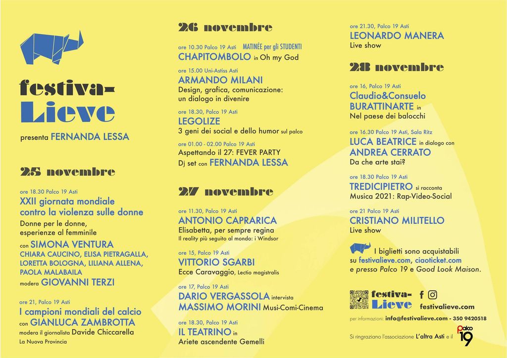 Gli appuntamenti del 26 novembre inizieranno con una matinée per le scuole dello spettacolo Oh my God e proseguiranno alle 15, in UniAstiss con la lezione di Armando Milani, il designer autore del logo dell’Onu con la colomba, che parlerà di Design, grafica e comunicazione: un dialogo in divenire presentando i manifesti di comunicazione sociale che gli studenti dell’Accademia di Belle Arti di Cuneo hanno preparato dopo un laboratorio formativo con Milani. L’incontro con i Legolize, i geniali maghi dei social e testimonial della Lego delle 18.30 chiuderà il pomeriggio, mentre la notte sarà animata da un Fever party con la top model e dj Fernanda Lessa al Palco 19, che poi si fermerà a presentare tutti gli altri appuntamenti di FestivaLieve.