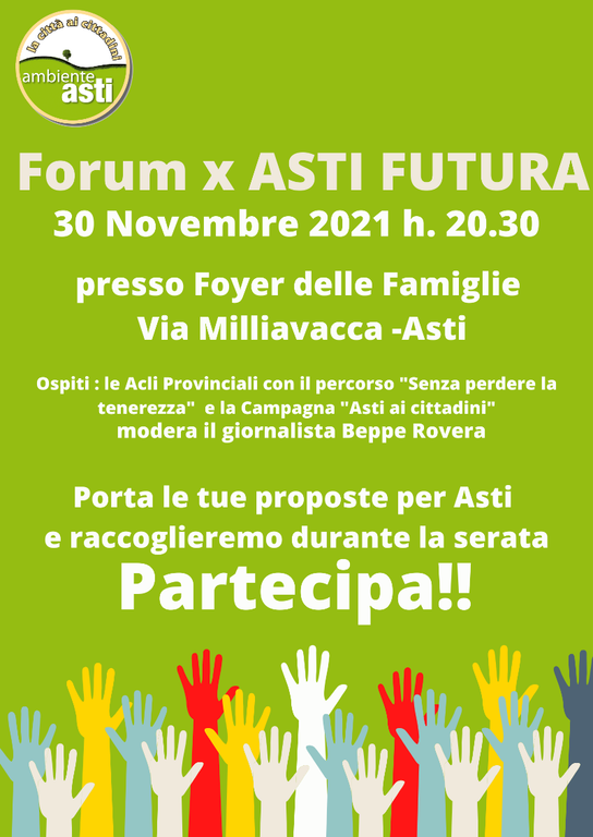Un forum sul futuro della città di Asti. È quanto ha promosso Ambiente Asti per il 30 novembre alle 20.30 al Foyer delle Famiglie.