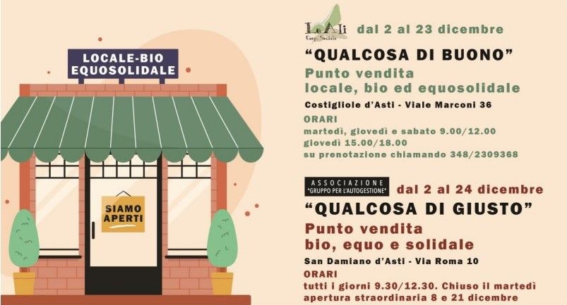 Che sarà presente a San Damiano, presso il punto vendita 'Qualcosa di giusto' in via Roma 10 grazie al prezioso lavoro dei volontari Associazione ' Gruppo per l'Autogestione' e a Costigliole d'Asti con punto vendita 'Qualcosa di buono' in viale Marconi 36 nella sede operativa della Cooperativa sociale Le Ali .