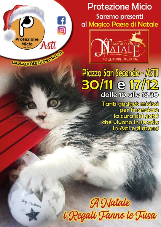 Anche il gatto è uno dei protagonisti del ‘Magico Paese di Natale’ di Asti, in quanto le splendide volontarie di Protezione Micio hanno allestito un banchetto con deliziosi gadget che, non solo valorizzeranno le case degli amanti dell’adorabile felino, ma aiuteranno i micini più sfortunati, malati o senza il calore di una casa.