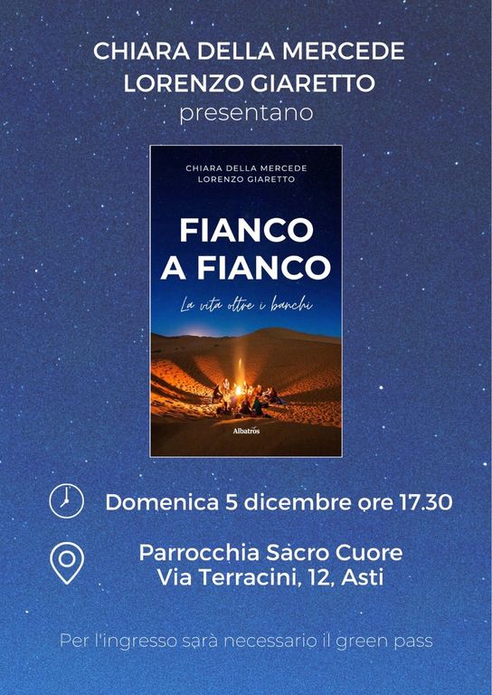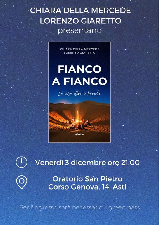 Dopo il successo di quella fatta al Polo Universitario di Asti, risalente al 24 settembre, le presentazioni del libro “Fianco a fianco – La vita oltre i banchi” scritto a quattro mano da Chiara Della Mercede e Lorenzo Giaretto ed edito dal Gruppo Albatros Il Filo proseguono con due nuovi appuntamenti in programma nel fine settimana: venerdì 3 dicembre alle 21 presso la Parrocchia di San Pietro (corso Genova 14) e domenica 5 alle 17.30 presso la Parrocchia del Sacro Cuore (via Terracini 12). Per accedere ad entrambi gli eventi sarà necessario il green pass.