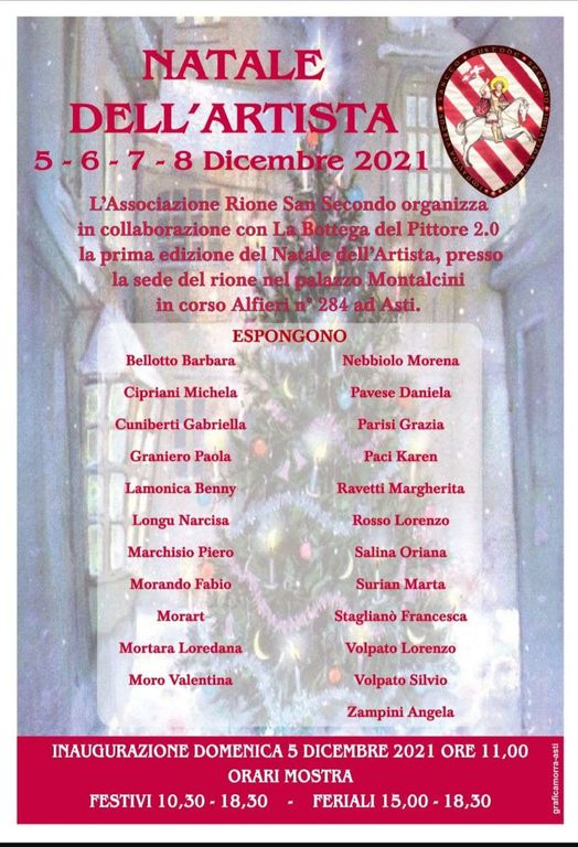 Iniziando dalla mostra collettiva “Natale dell’artista” che il Rione San Secondo ha organizzato presso la propria sede di corso Alfieri 284. Inaugurata ieri mattina, sarà visitabile fino a mercoledì 8 in orario 15-18.30 e 10.30-18.30 nel giorno dell’Immacolata.