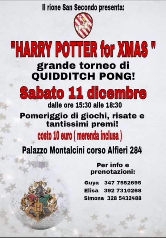 Arriviamo così a sabato 11 dicembre, quando il Rione San Secondo proporrà “Harry Potter for Xmas”, grande torneo di Quidditch pong in programma dalle 15.30 alle 18.30 con tanti giochi, risate e premi. Il tutto presso la sede del Rione. Sempre sabato 11 sono in programma la cena di Natale del Borgo San Marzanotto (alle 20, presso il salone parrocchiale Alpini della frazione) e quella del quarantennale proposta dal Borgo Don Bosco al Palco 19 di via Ospedale, sempre alle 20.