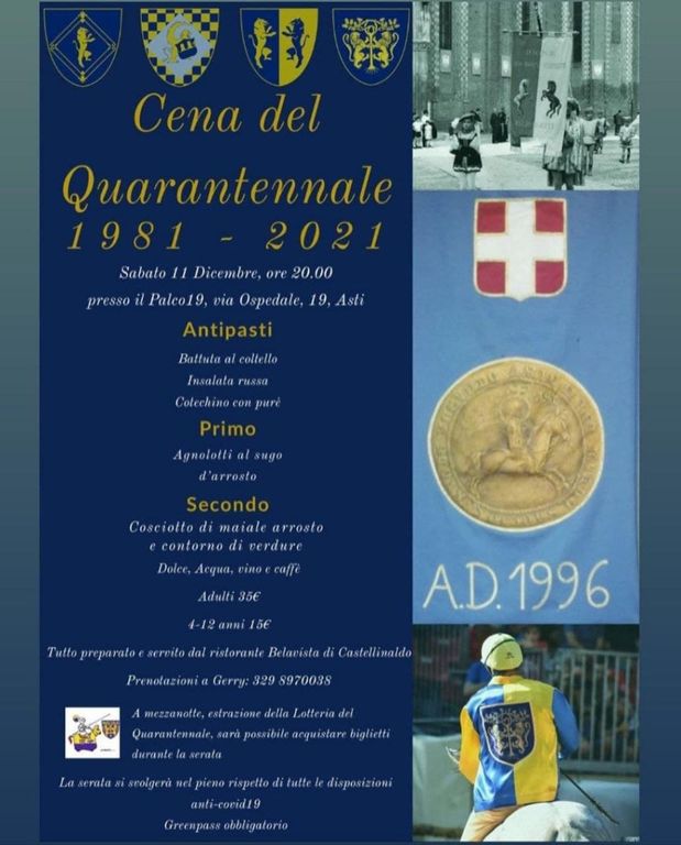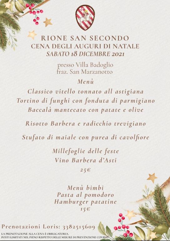 Spostandoci alla settimana successiva, ovvero sabato 18 dicembre, resta da segnalare la cena augurale del Rione San Secondo, in programma presso Villa Badoglio, in frazione San Marzanotto.