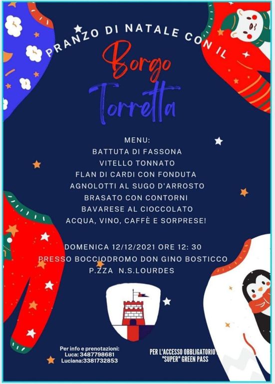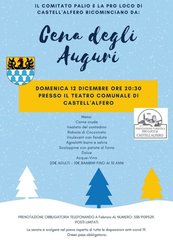 Altro appuntamento gastronomico è in programma domenica 12, alle 12.30, presso il bocciodromo Don Gino Bosticco di piazza N. S. di Lourdes, che ospiterà il pranzo di Natale del Borgo Torretta. Mentre alle 20.30 si svolgerà presso il teatro comunale di Castell’Alfero la cena augurale del Comitato Palio e della Pro Loco del paese.