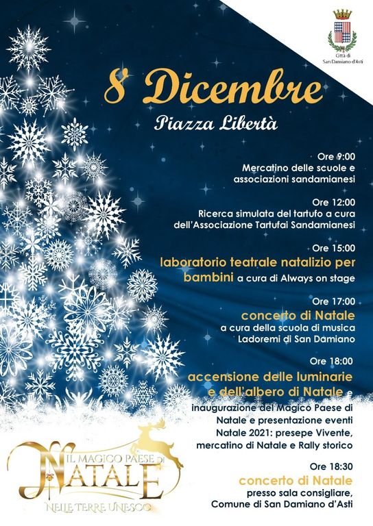 Questa è poi la settimana centrale per gli eventi natalizi di San Damiano. Domani si aprirà ufficialmente il periodo natalizio con l'accensione dell'albero di Natale e le luminarie. Prima dell'accensione, il concerto La do re mi. A seguire apertura degli eventi natalizi in collaborazione con il Magico Paese di Natale. Poi nuovo momento musicale con note natalizie in sala consiliare. Spazio anche ai mercatini e al presepe vivente da sabato 11.