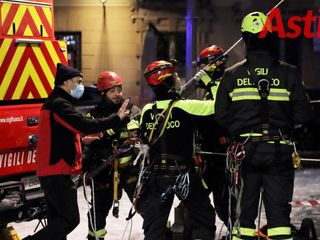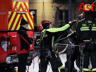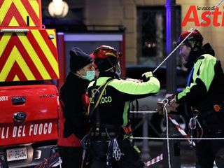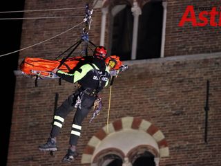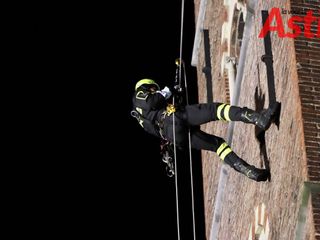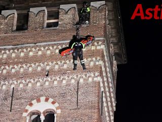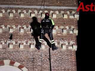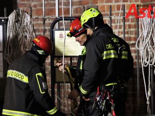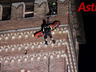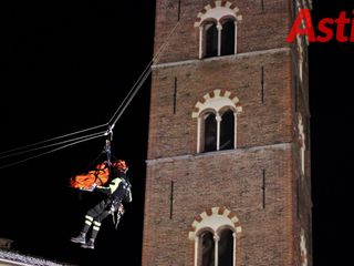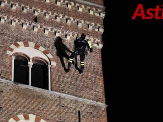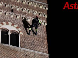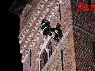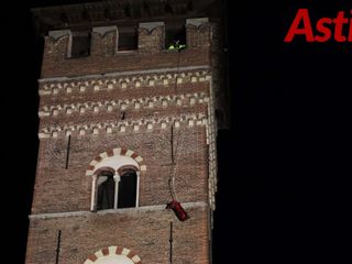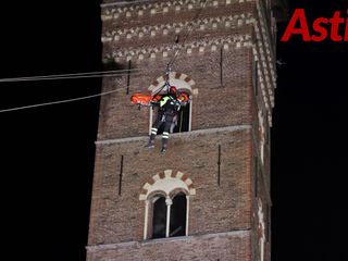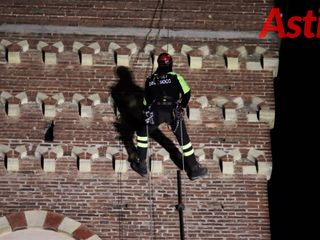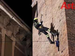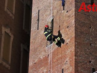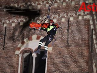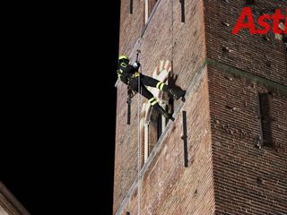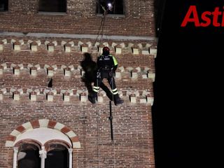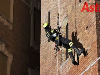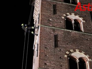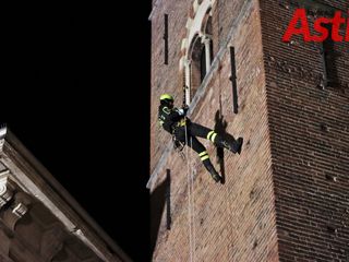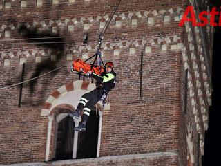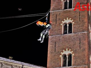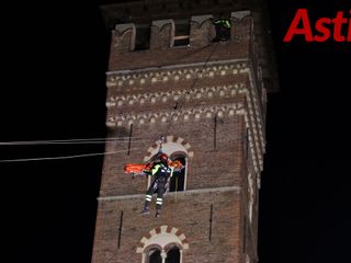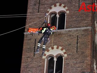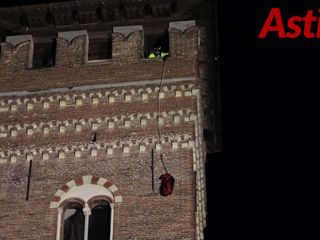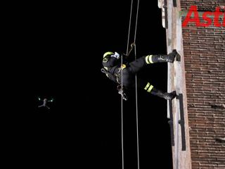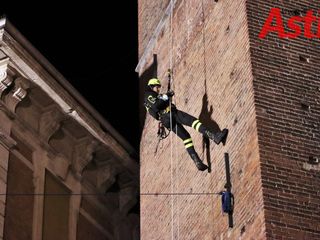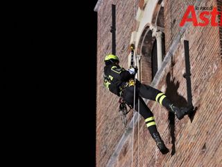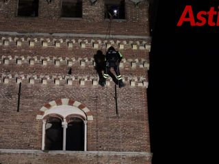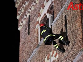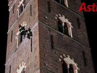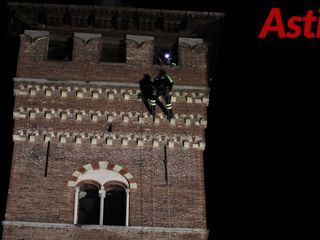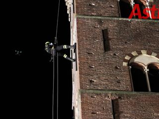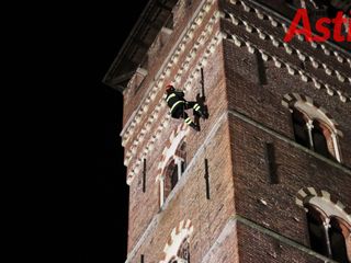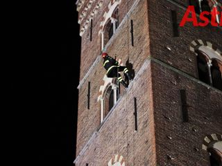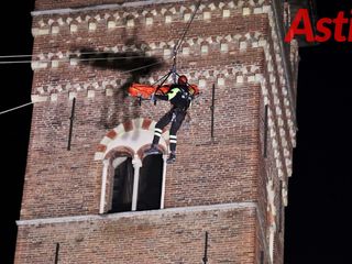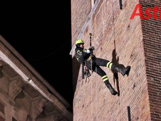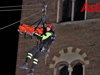 Ieri sera spettacolare addestramento in notturna del Nucleo SAF dei vigili del fuoco di Asti, che hanno simulato il salvataggio di una persona in cima alla Torre