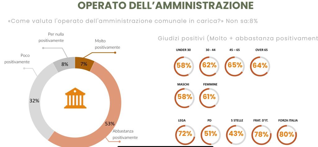 Parallelamente, approvato (60% di giudizi positivi, con un 53% di “abbastanza positivo” e il restante 7% di “molto”) anche l’operato della Giunta. Anche in questo caso i giudizi più positivi sono stati espressi da elettori dell’area politica di riferimento della maggioranza, ma più “spalmati” su tutte le fasce d’età.