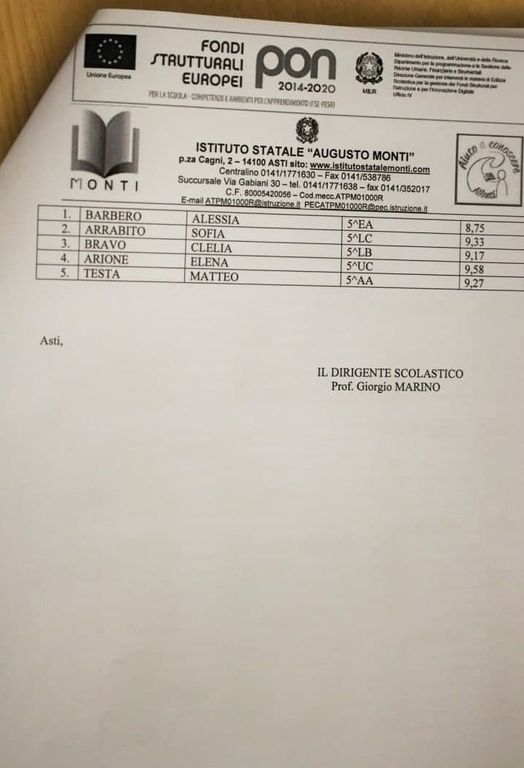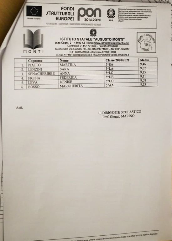 Alle 12.30, nell’Aula Magna dell’istituto, il Dirigente Scolastico, prof. Giorgio Marino, ha conferito le borse di studio ai migliori studenti proprio dell’anno scolastico 2019/2020: Parigi Nicole, Morando Marta, Ndayiragije Joy, Boccia Debora, Cazzola Serena, Careglio Marella, Ech Chennouf Aya, Meloni Alessia, De Sarro Giulia, Obialero Francesca, Carrretto Andrea, Dragomir Georgiana Angelica, Obialero Benedetta, Vallana Veronica, Staccione Sara, Bandiera Marta, Orlandi Francesco, Piatto Martina, Lenzini Sara, Senacheribbe Anna, Fresia Federica, Leva Denise, Bosso Margherita, Barbero Alessia, Arrabito Sofia, Bravo Clelia, Arione Elena, Testa Matteo.