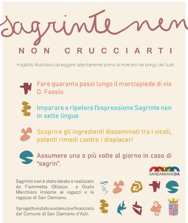 Il progetto è un rimedio collettivo, diffuso e inclusivo per i “Sagrin” termine del dialetto piemontese che significa: cruccio, dispiacere, problema. L’opera principale, realizzata lungo il marciapiede di via Fassio, è una scritta di 40 metri con le traduzioni di “Sagrinte nen”, nelle lingue delle comunità che abitano la Città di San Damiano: albanese, rumeno, tedesco, arabo, macedone e inglese. I vicoli del borgo sono disseminati di parole associate a forme e colori che rappresentano alcuni rimedi pensati dai ragazzi e dalle ragazze contro i “Sagrin”.
