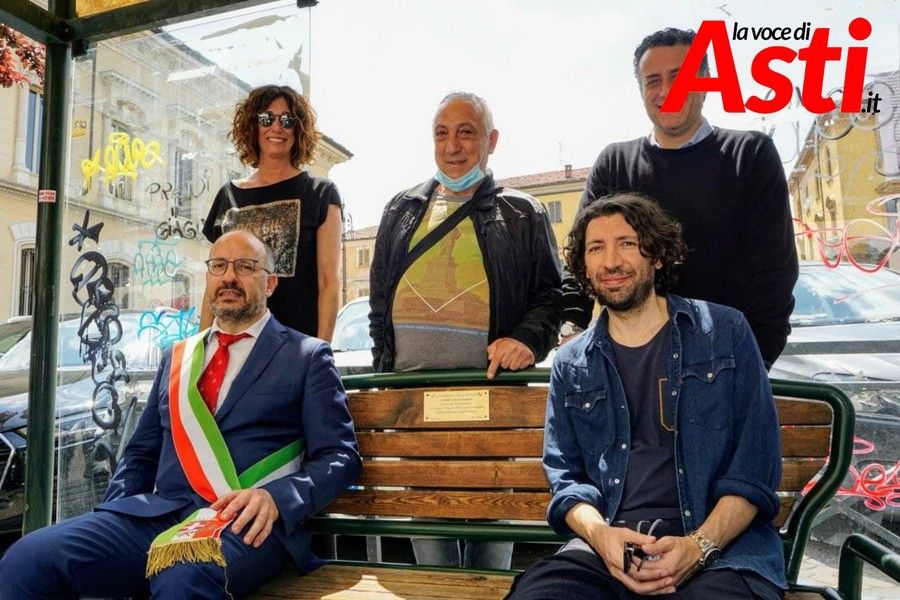 Nello scatto di MerfePhoto, risalente all'inaugurazione della targa nel marzo 2021, Ariosto (al centro, in piedi) con la presidente della Biblioteca Astense Roberta Bellesini, il direttore dell'Asti Film Festival Riccardo Costa, il sindaco Maurizio Rasero e l'attore Herbert Ballerina, primo vincitore del premio intitolato ai fratelli Bugnano