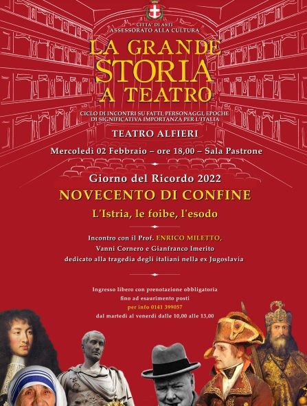 Mercoledì 2 febbraio alle 18 in Sala Pastrone nuovo appuntamento con La Grande Storia a Teatro. In programma "Novecento di confine - L'Istria, le foibe, l'esodo", incontro con il prof. Enrico Miletto, Vanni Cornero e Gianfranco Imerito dedicato alla tragedia degli italiani nella ex Jugoslavia.