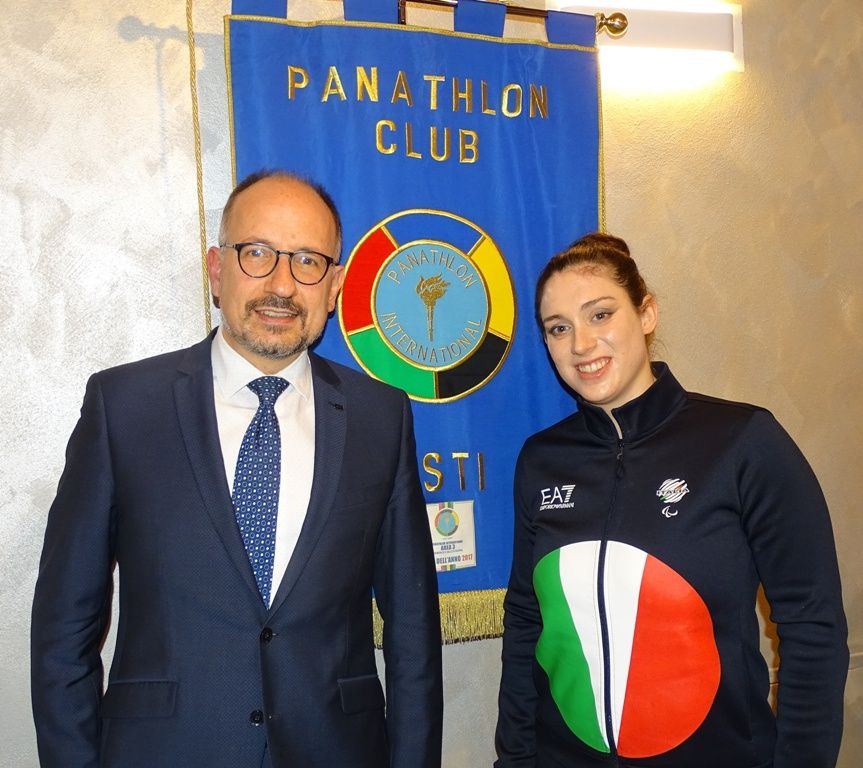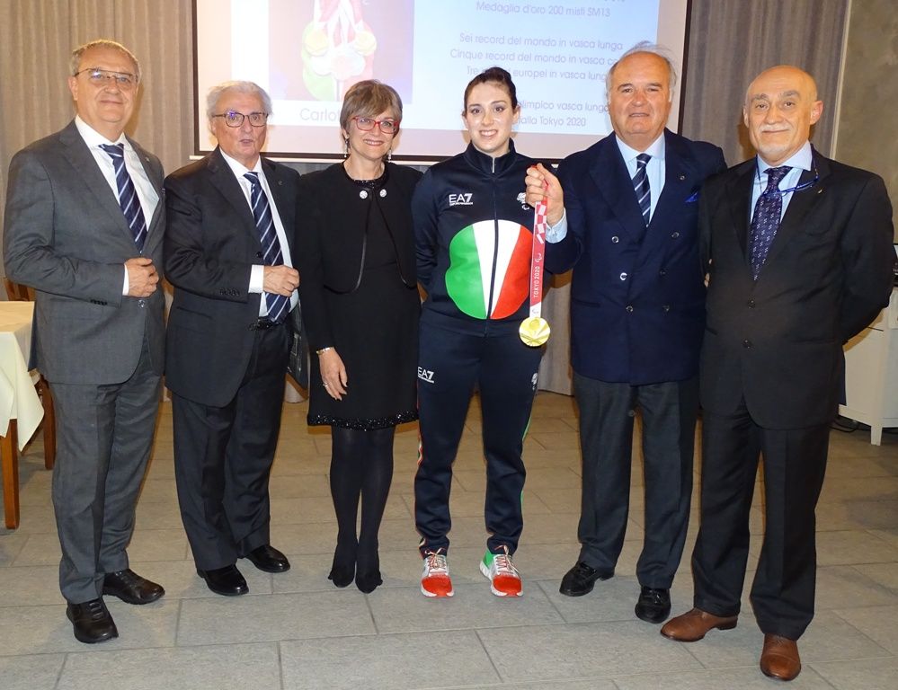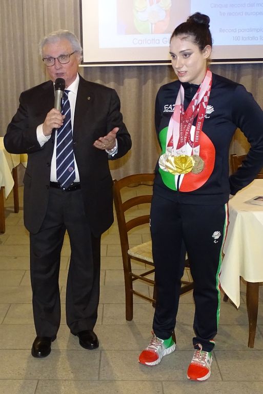 La prima Conviviale di Ezio Mosso in veste di presidente del Panathlon Club Astigiano è stata caratterizzata dai cinque cerchi olimpici portati ‘in dote’ dall’ospite della serata. Ovvero Carlotta Gilli, nuotatrice torinese, pluricampionessa paralimpica a Tokyo 2020, affetta dalla malattia di Stargardt. Tesserata per la Rari Nantes Torino e per il G.S. “Fiamme oro” della Polizia di Stato ed “Ambasciatrice” Telethon.