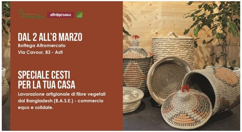 Da domani, mercoledì 2, a martedì 8 marzo alla Bottega Rava e Fava di via Cavour 83 in Asti sarà tempo di cesti per la casa, con vasta e variegata esposizione proveniente dal Bangladesh attraverso il circuito del commercio equo e solidale.