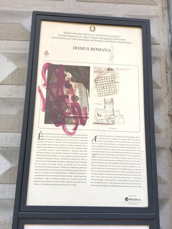 A due passi c'è la Domus Romana: il cartello all'ingresso è vandalizzato, ma la Fondazione Asti Musei, che brilla con Palazzo Mazzetti sulla via Maestra, continua a non accorgersene. Noi la cultura la promuoviamo così.