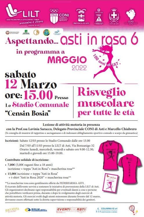 Nell’attesa della camminata “Asti in rosa 6”, in programma nel mese di maggio, LILT e CONI operano ancora una volta insieme per trasmettere l’importante messaggio della prevenzione mediante l’acquisizione di buone abitudini di vita, quali il regolare svolgimento dell’attività motoria, esigenza oggi particolarmente sentita dopo tanti mesi di inattività a causa della pandemia.